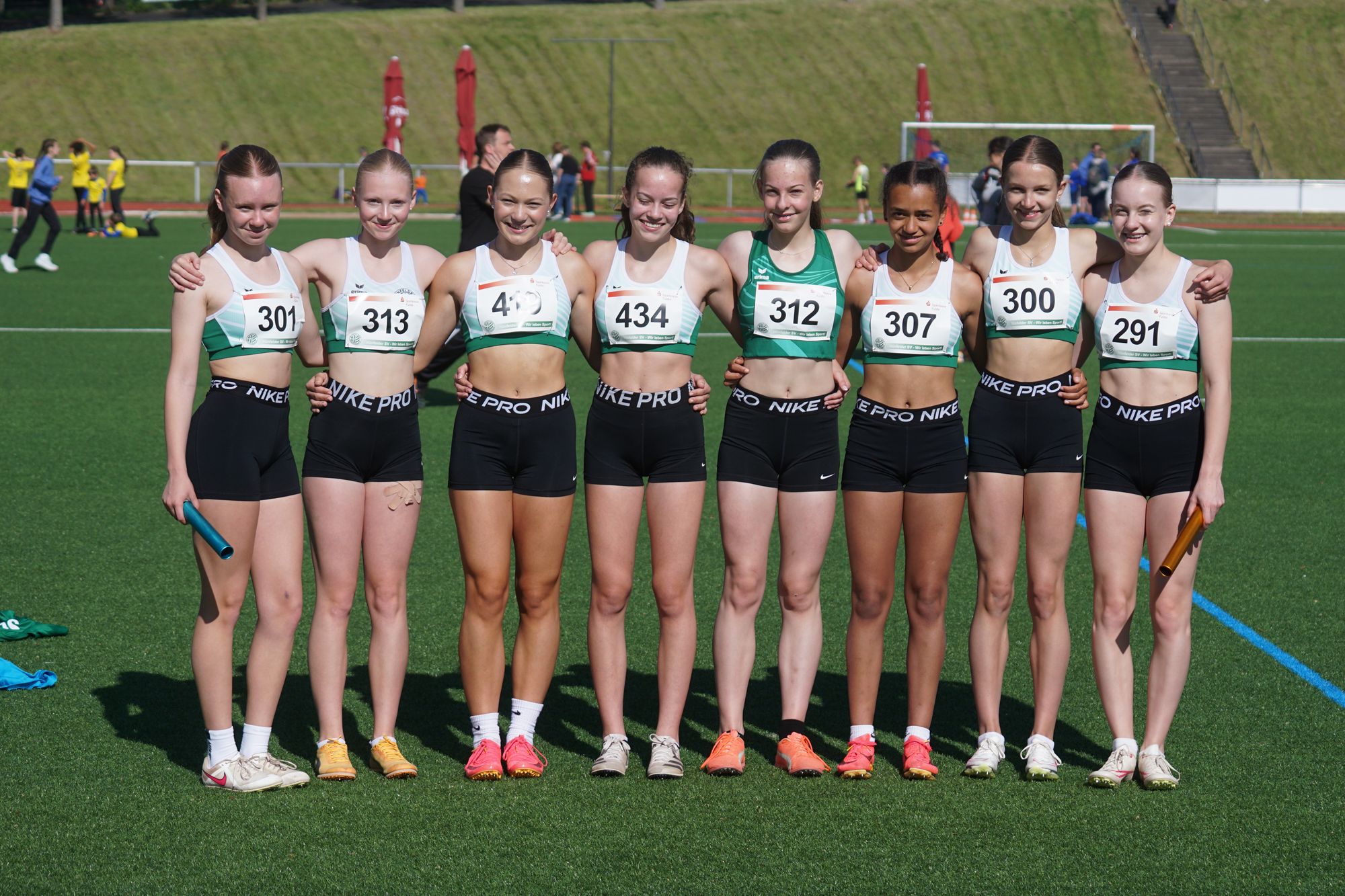 Dann der Start des Staffelrennens. Die Mädels sind flott unterwegs. Der erste Wechsel klappt bei der Staffel die die Norm heute laufen soll nahezu perfekt, bei der zweiten Staffel – die ist die Norm letzte Woche bereits gelaufen – sieht es nicht so gut aus, da bleibt beim Wechsel einiges an Zeit liegen. Alle anderen Hochgeschwindigkeitswechsel – klappen dann bei beiden Staffeln! Im Ziel ist die Uhr für die erste Staffel bei exakt 50,50 Sekunden stehen geblieben. Das Ziel ist erreicht!