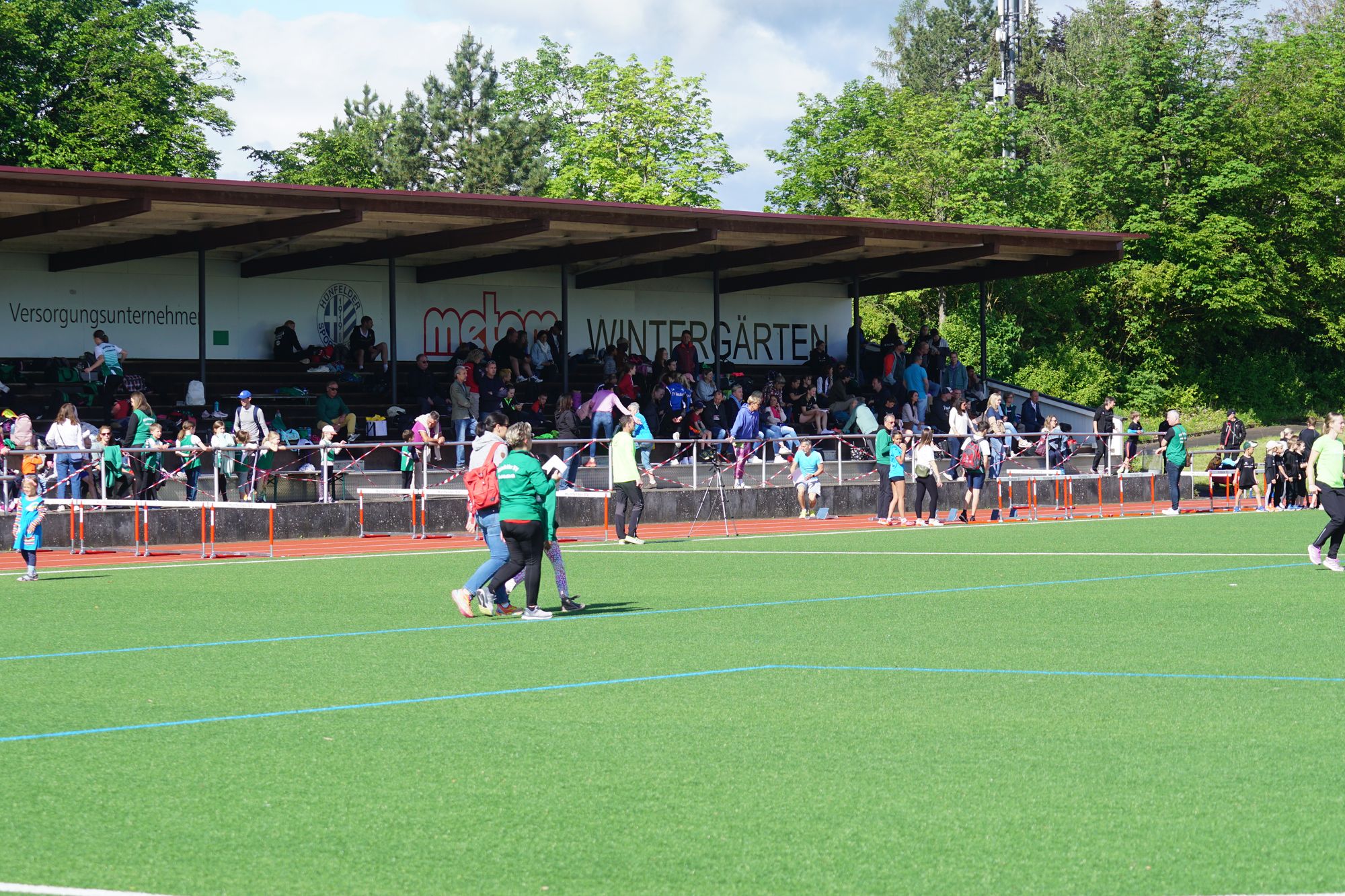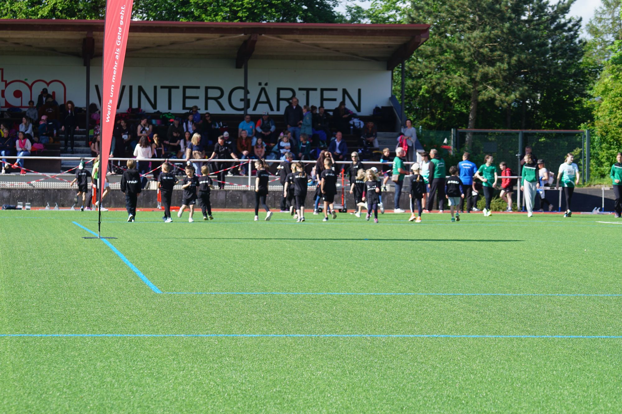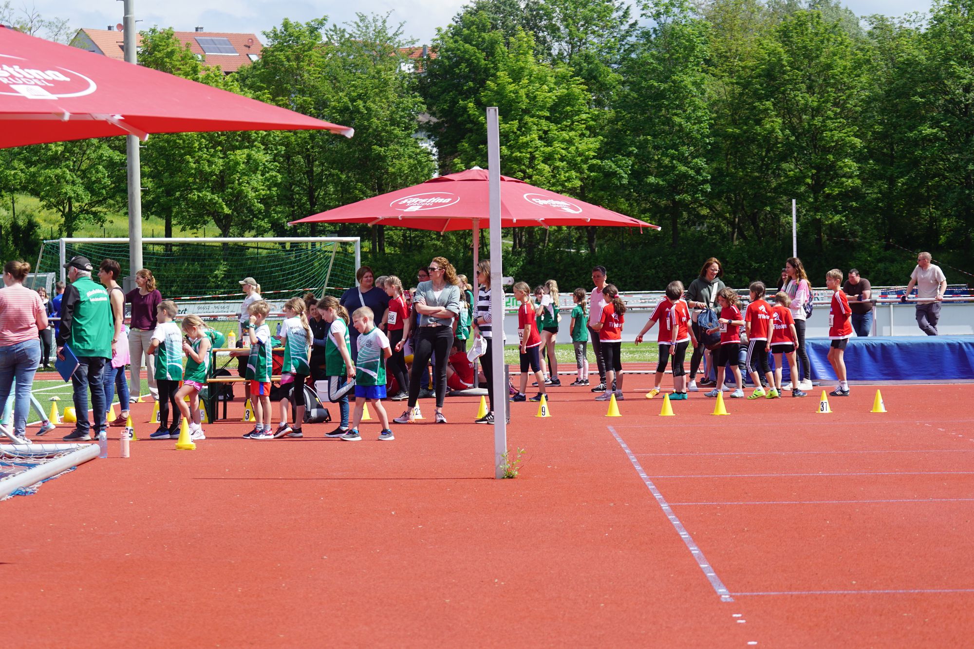 Nach der Staffel – bei dem Rennen haben auch schon viele zugesehen – geht es dann so richtig los. In der KiLa sind 34 Mannschaften (7 x U8, 15 x U10, 12 x U12) zwei mehr als im vergangenen Jahr an den Start gegangen. Los ging es um 09:30 Uhr mit der KiLa U12, die KiLa U8 folgte nur 30 Minuten später und nach dem Mittag war dann die KiLa U10 dran. Daneben dann noch die angebotenen Disziplinen der klassischen Leichtathletik (Weitsprung, Kugelstoßen, Speerwurf, Ballwurf, Hürden, Sprint, Mittelstrecke, …); es war einiges zu sehen.