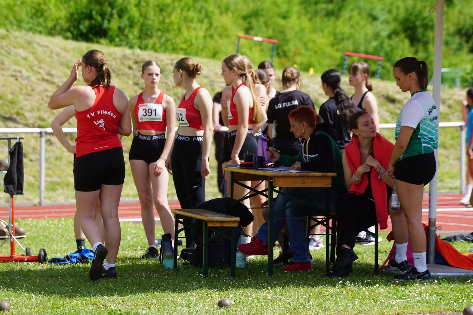 Los ging es um 09:20 Uhr mit 2 U16 Mädchen-Staffeln der Startgemeinschaft Hünfeld-Neuhof-Flieden. 10 Minuten vor dem eigentlichen Start der Veranstaltung. Eigentlich war geplant, die Staffeln gegen 14:00 Uhr starten zu lassen. Für Athleten und Besucher wäre das schon etwas besonderes gewesen, immerhin rangiert die erste Staffel auf Platz „2“ der aktuellen Deutschen Bestenliste. Klar definiertes Ziel war vor dem Staffelrennen aber auch, dass man mit 2 Staffeln zu den Deutschen will. Die Norm 51,5 Sekunden selber haben die Staffeln bereits zweimal mit 49,64 und 50,94 Sekunden deutlich unterboten. Aber um mit 2 Staffeln zu den Deutschen zu kommen braucht man 2 Staffeln in denen 8 verschiedene Athleten laufen. Und genau das sollte dann heute auch erreicht werden. Und der Start so früh, damit einfach möglichst nichts durch äußere Einflüsse schief geht. Über den Tag gesehen waren bei dieser Veranstaltung schon gut 1.500 Menschen auf der Rhönkampfbahn.