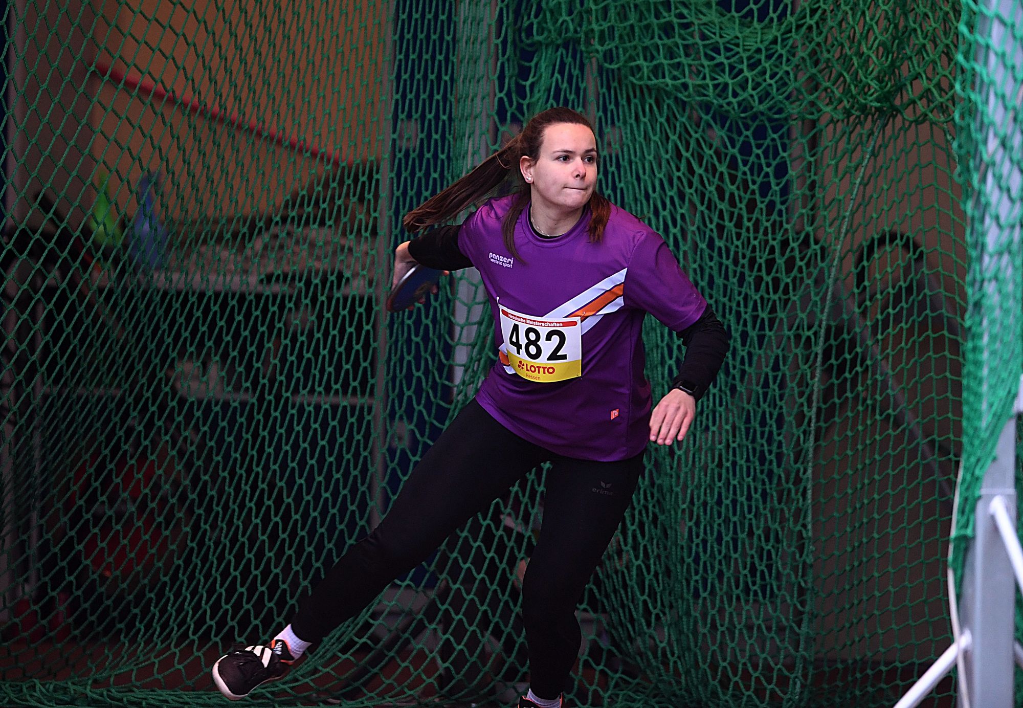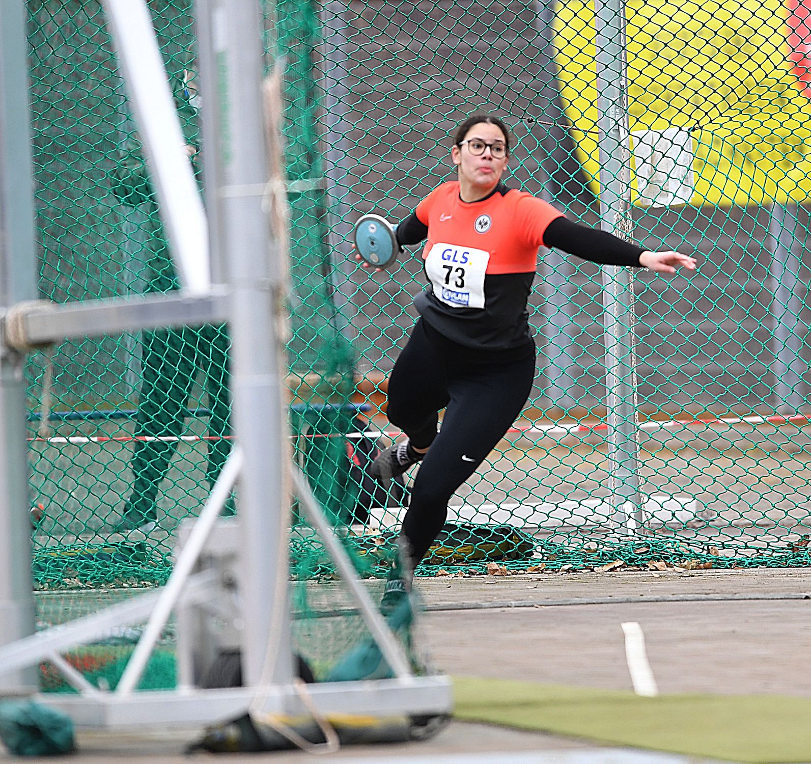 Bei den Winterwurf-Meisterschaften der U18 ging Milina Wepiwe (TSG Wehrheim) mit 45,34 Metern als Führende der Meldeliste in den Diskus Wettkampf, dicht gefolgt von Curly Brown (Eintracht Frankfurt), bei der 45,30 Meter auf der Habenseite standen. Für ein spannendes „Hessen-Duell“ war also gesorgt. Auch der Druck der Qualifikation fiel weg, da nur sieben Athletinnen in den Ring gingen und somit alle Athletinnen automatisch sechs Versuche hatte. Brown setzte gleich im ersten Durchgang mit guten 44,94 Metern eine erste Marke. Es folgten noch vier weitere Würfe jenseits der 41 Meter. In der fünften Runde passte es bei Curly dann optimal - starke 46,19 Meter bedeuteten eine neue Bestweite, erneut die EM-Norm für Jerusalem und den sicheren Sieg. Eine tolle Leistung, ist es doch das erste Jahr in der U18 für die Eintrachtlerin. Medaillenanwärterin Milina Wepiwe hatte technische Probleme und kam lediglich auf 39,41 Meter. Damit lag die Wehrheimen kurzfristig auf dem Bronzerang, wurde dann aber noch von Soraya Sprenger (LG Steinlach-Zollern) mit 39,52 Metern aus den Edelmetallrängen verdrängt.