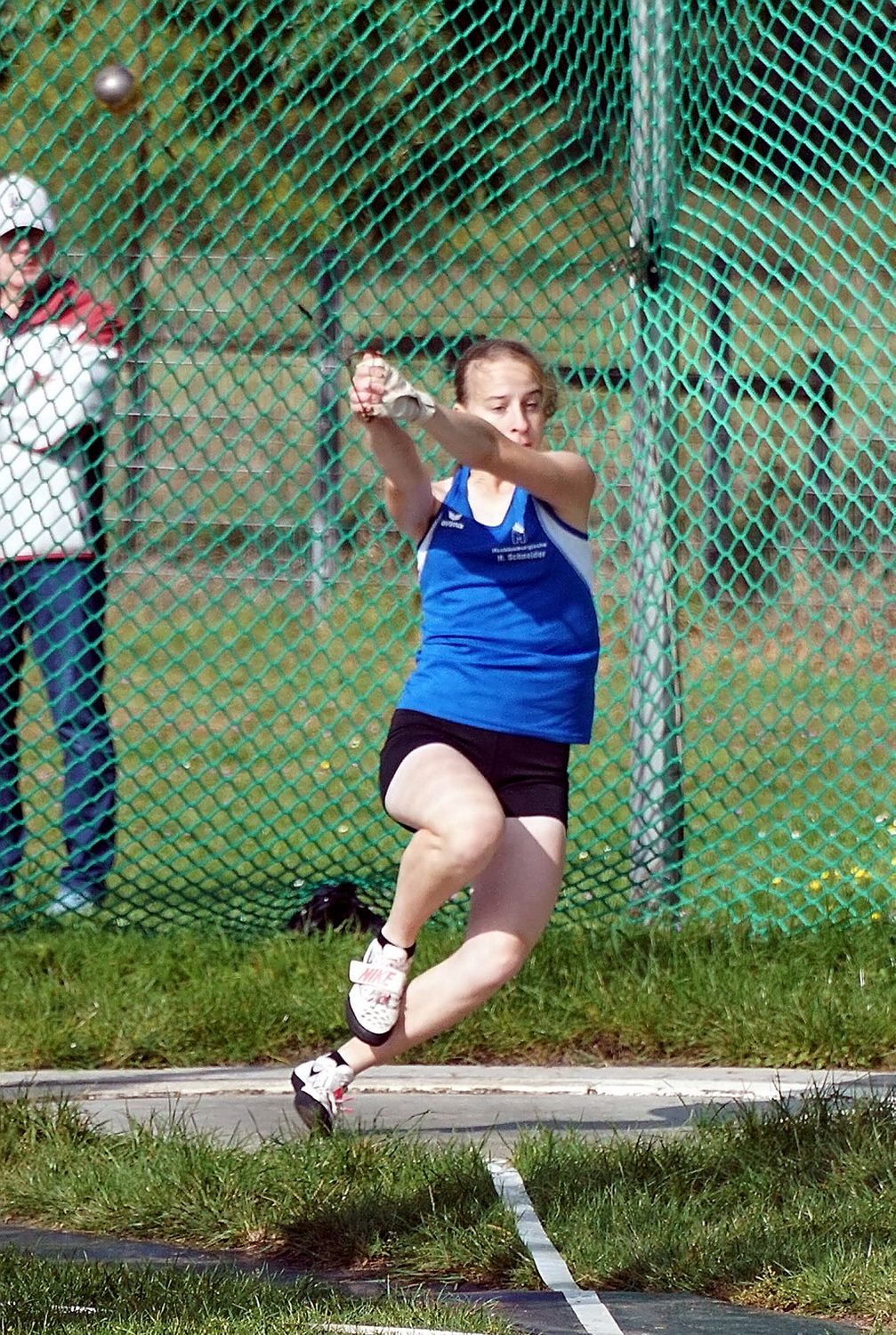 Auf den Punkt topfit zeigte sich Leni Sommerlade (ESV Jahn Treysa) im Hammerwerfen der weiblichen Jugend U 18. Nach einem Fehlversuch steigerte sich die Landesmeisterin im Vorkampf auf 53,67 Meter und imponierte im Endkampf mit einer abermaligen Verbesserung auf 54,18 Meter – Platz sechs.
