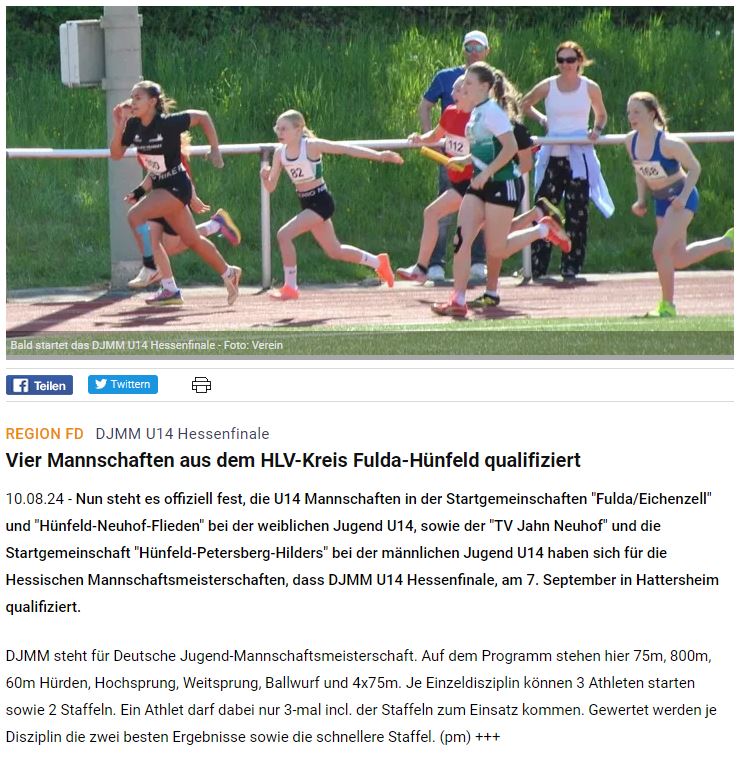 Nun steht es offiziell fest, die U14 Mannschaften in der Startgemeinschaften "Fulda/Eichenzell" und "Hünfeld-Neuhof-Flieden" bei der weiblichen Jugend U14, sowie der "TV Jahn Neuhof " und die Startgemeinschaft "Hünfeld-Petersberg-Hilders" bei der männlichen Jugend U14 haben sich für die Hessischen Mannschaftsmeisterschaften, dass DJMM U14 Hessenfinale, am 7. September in Hattersheim qualifiziert.