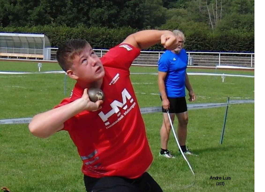 Lediglich einen Tag nach seiner Rekordweite beim Werfertag des TSV Twiste (wir berichteten) legte Luis Andre beim Abendsportfest der LG Solling in Uslar eine weite Schippe drauf und steigerte sich nach einer gelungenen Auftaktweite von 16,82 m über 16,95 m im letzten Durchgang auf 17,20 m. Damit erhöhte der 1,97 m große und 91 Kilogramm schwere Nachwuchs-Athlet seinen Vorsprung im DLV-Ranking vor Shaun-Paul Fritzsche (SV Vorwärts Zwickau/15,24 m) auf fast zwei Meter. „Mit diesen Leistungen zeigte Luis seine Fähigkeiten sich zu konzentrieren“, sagte Trainer Alwin Wagner, und bestätigte einmal mehr seine gesamte Jahresentwicklung, die bei der Kreis-Hallen-Meisterschaft mit 15,94 m begann. Mit 12,07 m übertraf Johannes Berg (MT) im Kugelstoßen der MJU 20 erstmals die 12-Meter-Marke. M 60- Senior Bernd Gabel (MT) sprintete die 100 Meter in 12,1 Sekunden.