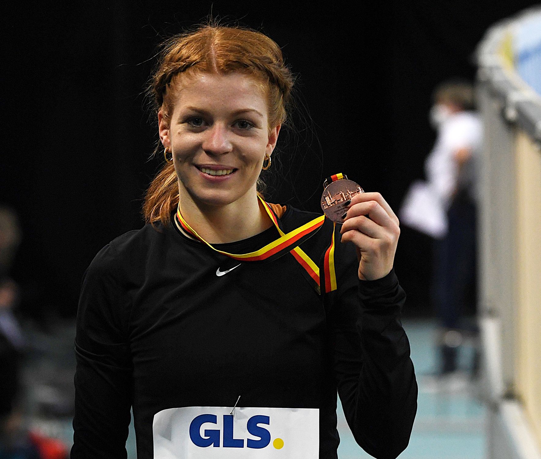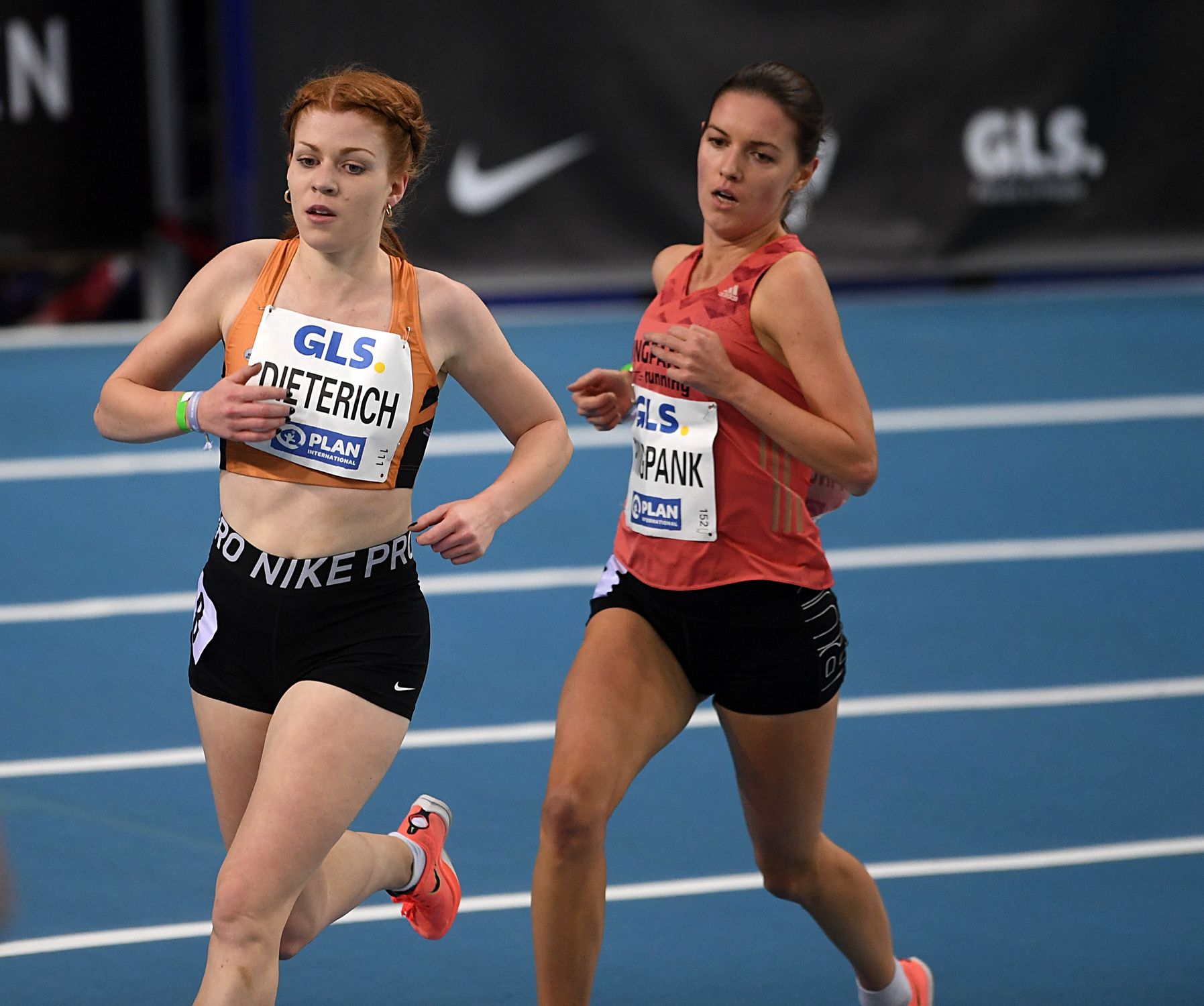 Zu einer beeindruckenden Solo-Vorstellung wurden die 3000 Meter der Frauen. Hanna Klein (LAV Stadtwerke Tübingen) trat nach einem guten Kilometer beherzt an und sprengte damit das Feld problemlos. Den Rest des Rennens spulte die Olympiateilnehmern von der Spitze weg im Alleingang ab und holte sich in 8:51,18 Minuten mit riesigem Vorsprung ihren bereits dritten DM-Titel. Die Gruppe der Verfolgerinnen wurde von Lea Meyer (ASV Köln) angeführt, die mit 9:06,64 Minuten die Vizemeisterschaft eintütete. Im Scheitelpunkt der letzten Kurve sah es noch so aus, dass Bronze an Sara Benfares (LC Rehlingen) gehen würde. Doch Eva Dieterich hatte in der Endphase des Rennens ihr Tempo konstant hoch gehalten, eisern gekämpft und sich Meter um Meter an das Top-Trio ran gearbeitet. Der Einsatz wurde belohnt, denn auf dem allerletzten Meter schob sich die Dieterich mit der neuen „PB“ von 9:10,39 Minuten und 0,02 Sekunden Vorsprung noch an der Saarländerin vorbei.