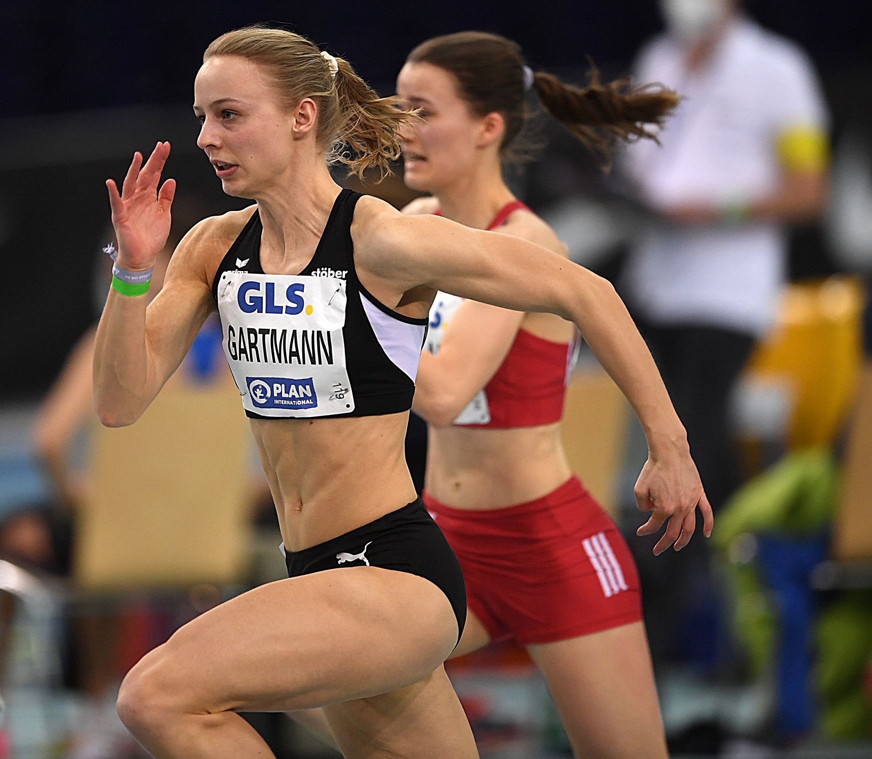 Hinzu kommt noch, dass Gartmann knapp 45 Minuten zuvor erneut auf der Bahn stand. Diesmal über die flachen 60 Meter. Auch hier wäre ihr fast erneut ein großer Coup gelungen. Mit schnellen 7,45 Sekunden (3.) folgte hier der nächste Haurekord. Hier fehlten nur winzige 0,02 Sekunden für die nächste Final-Teilnahme. In Hessen löste Gartmann mit ihrer starken Leistung Viktoria Koletzko (Wiesbadener LV/bisher 7,52 sec.) von der Spitze der Jahresbestenliste. Koletzko selbst ging in Leipzig ebenfalls in den Startblock, kam als Letzte im 2. Vorlauf mit 7,60 Sekunden jedoch nicht ganz an ihre Bestmarke ran. Auch für Antonia Schimpf (LG Fulda) zeigte die Stoppuhr 7,60 Sekunden (7. im 1. VL) an. Auch sie lief in dieser Saison bereits 7,54 Sekunden.