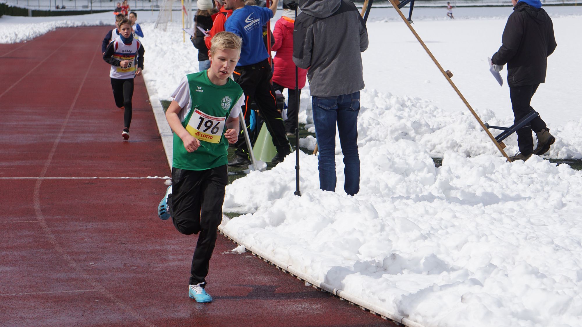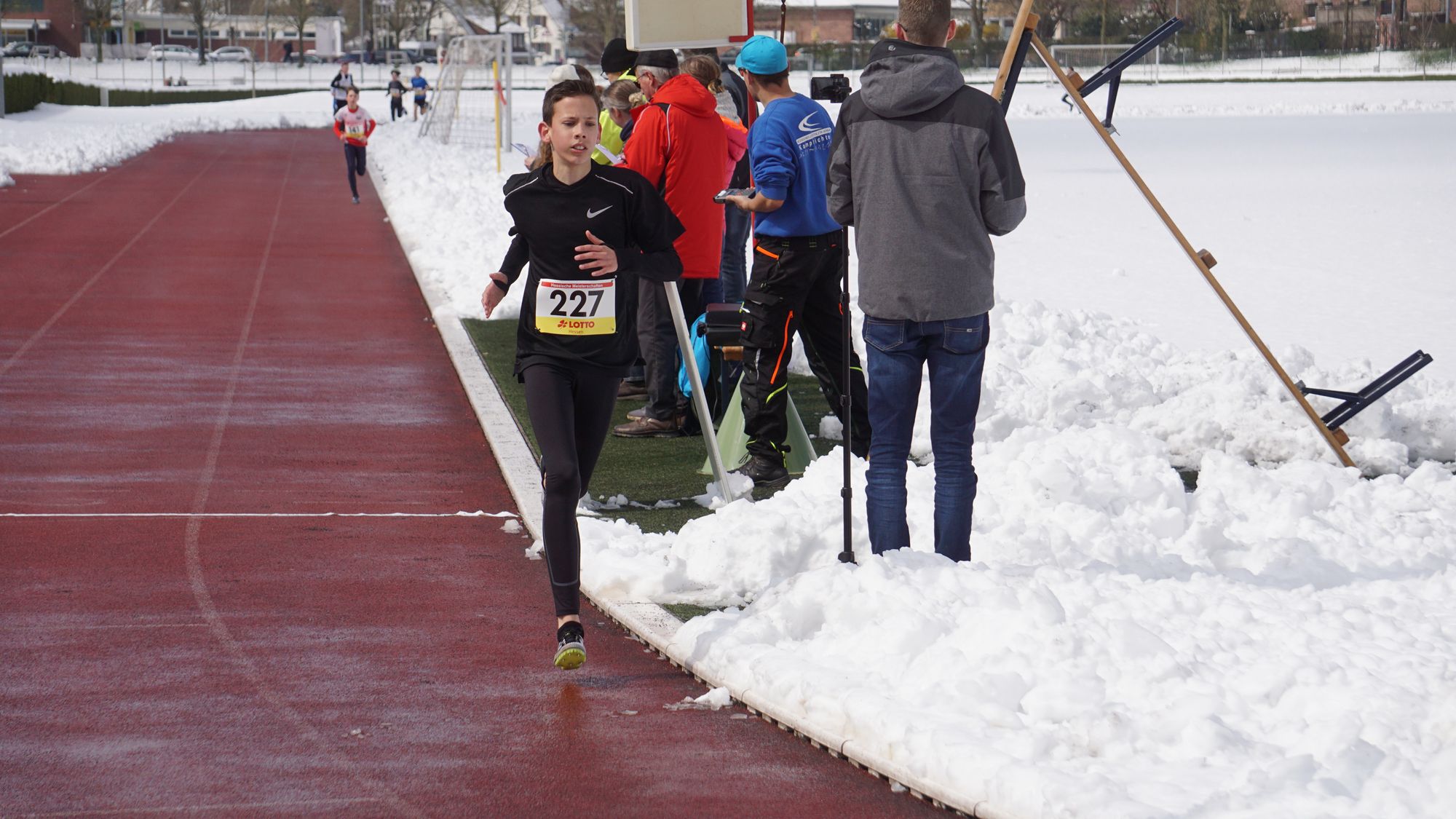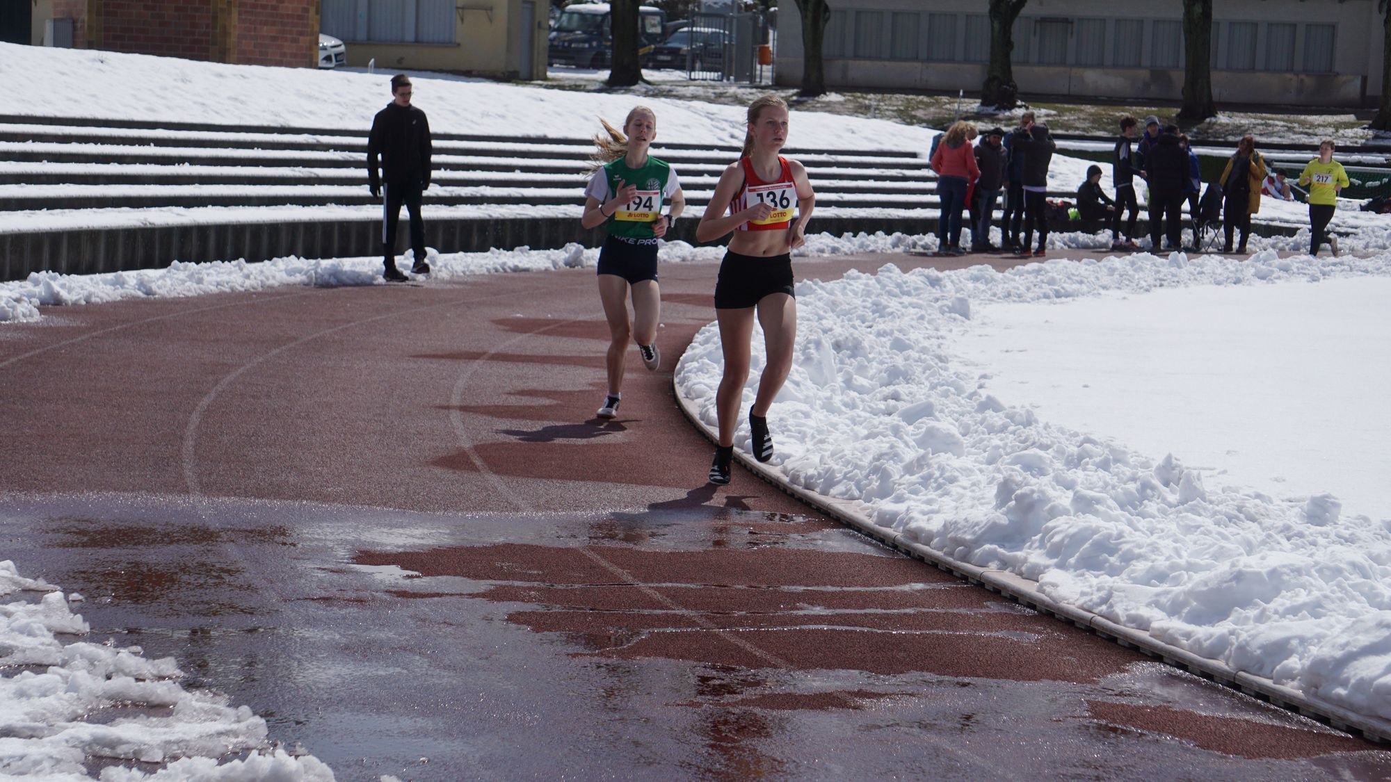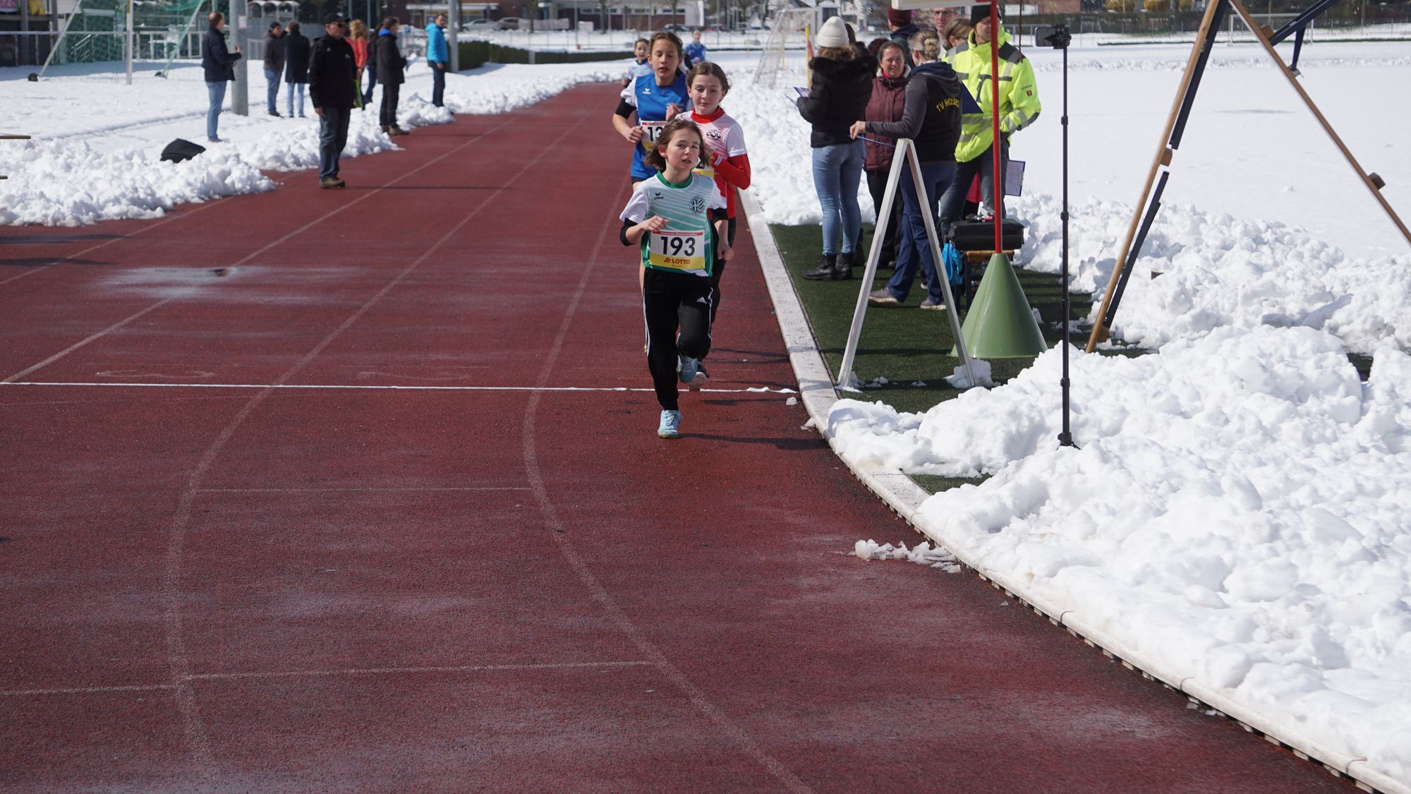 Eine geschlossene Schneedecke, Straßenglätte, umgefallene Bäume und blockierte Straßen haben dazu geführt, dass einiges nicht so lief wie es sollte! Da sah um 10 Uhr eine völlig eingeschneite Tartanbahn an der Helfer mit Schneeschiebern gerade damit begonnen hatten die Bahn freizulegen (Bild 1 in der Galerie). Und wie nicht anders zu erwarten kam es zu Verzögerungen. Erst sollte der Start statt um 11:00 Uhr um 11:10 Uhr stattfinden. Die fleißigen Helfer hatten die Bahn soweit hergerichtet, dass man darauf laufen konnte. Aber dann funktionierte auch noch die Kamera der Zeitmessanlage nicht! Schließlich konnte um 11:40 Uhr der erste Start erfolgen!