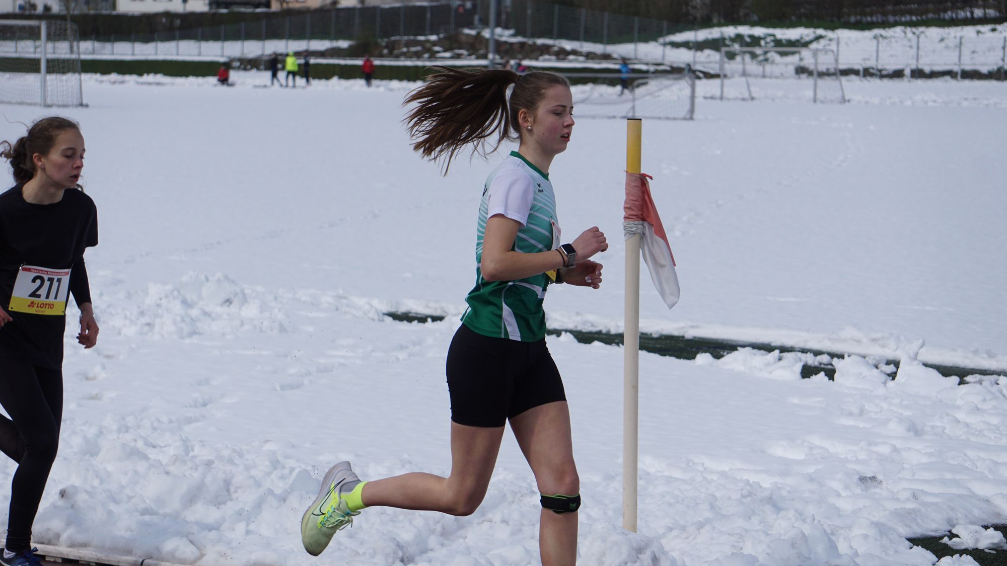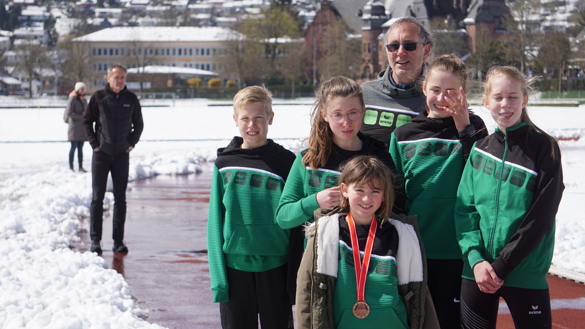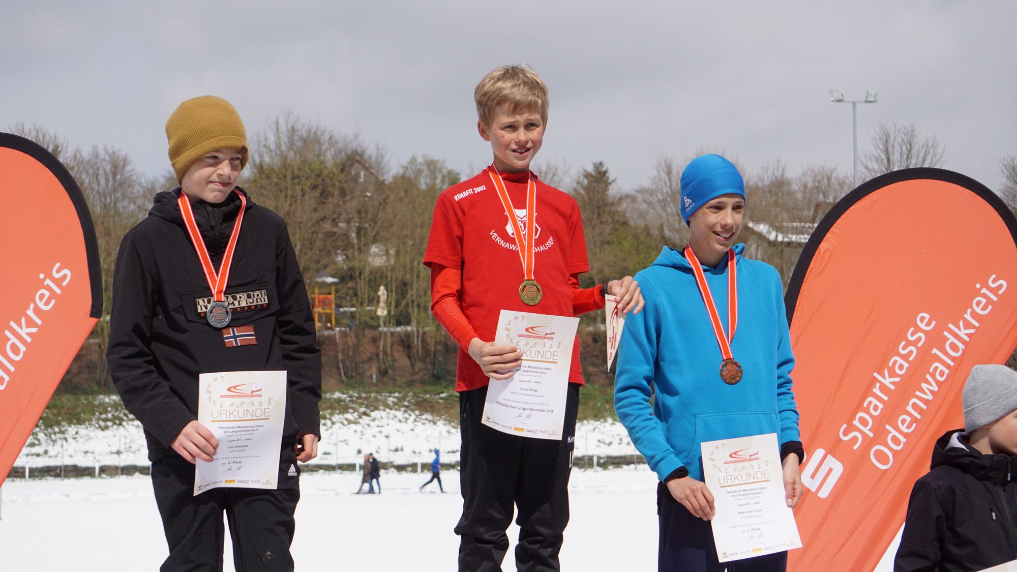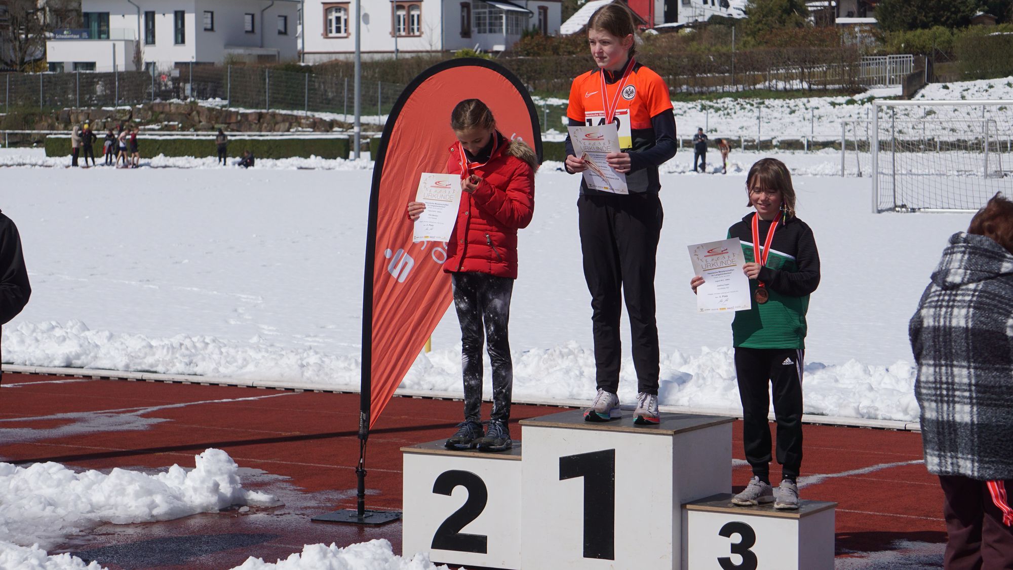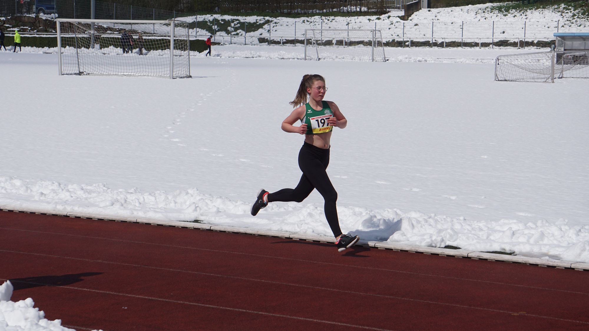 Eine geschlossene Schneedecke, Straßenglätte, umgefallene Bäume und blockierte Straßen haben dazu geführt, dass einiges nicht so lief wie es sollte! Da sah um 10 Uhr eine völlig eingeschneite Tartanbahn an der Helfer mit Schneeschiebern gerade damit begonnen hatten die Bahn freizulegen (Bild 1 in der Galerie). Und wie nicht anders zu erwarten kam es zu Verzögerungen. Erst sollte der Start statt um 11:00 Uhr um 11:10 Uhr stattfinden. Die fleißigen Helfer hatten die Bahn soweit hergerichtet, dass man darauf laufen konnte. Aber dann funktionierte auch noch die Kamera der Zeitmessanlage nicht! Schließlich konnte um 11:40 Uhr der erste Start erfolgen!