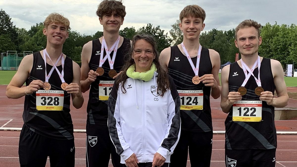 Auf Bronze abonniert waren die Athleten der StG Hessen Nord. Als Dritte in 3:32,28 Minuten über 4mal 400 Meter der Männer ließen Linus Schopf (Felsberg), Jonathan Klein (Elgershausen), Nick Frölich (Ermetheis) und Jakob Schmidt-Weigand (Jesberg) selbst die Eintracht Frankfurt sowie die Kreisauswahl Limburg/Weilburg hinter sich.