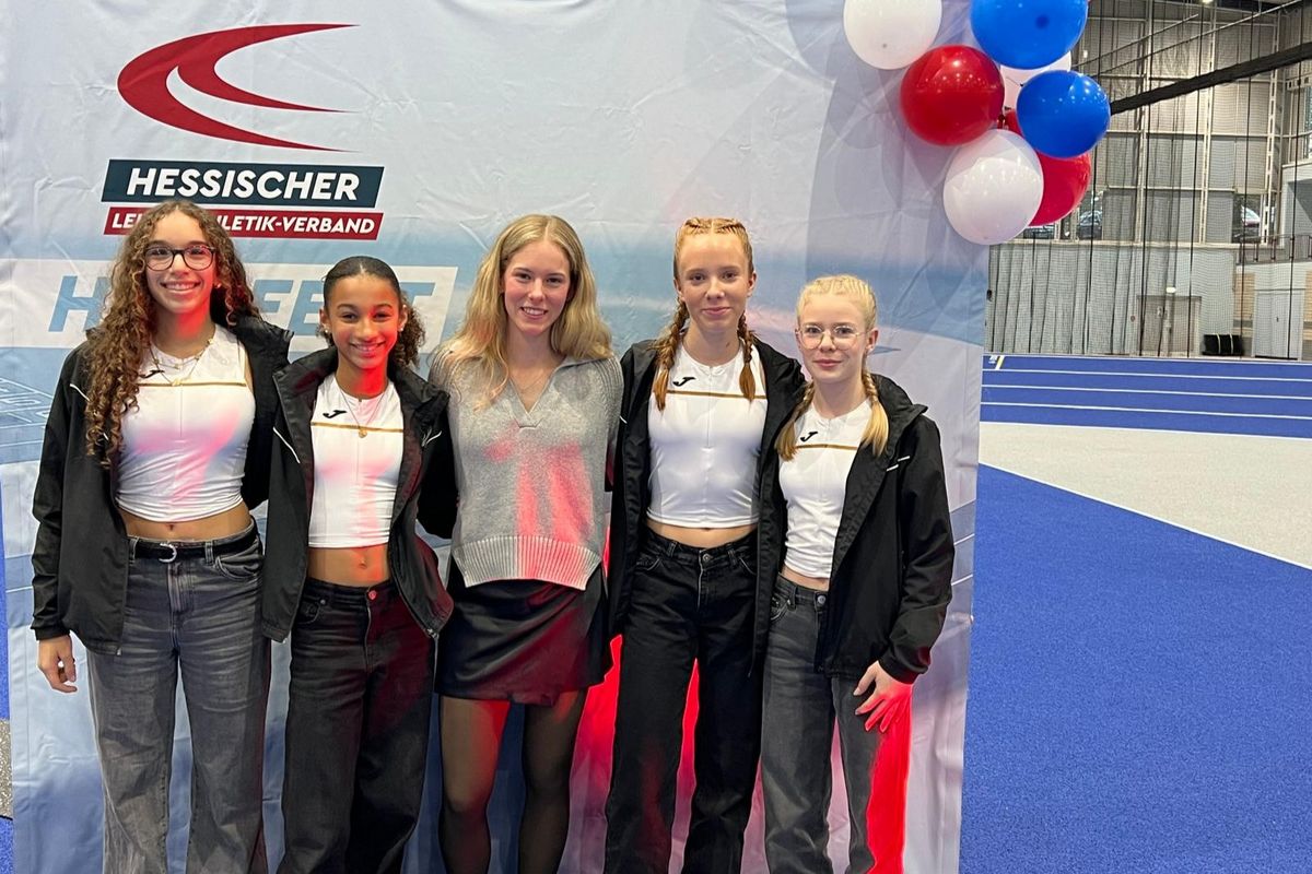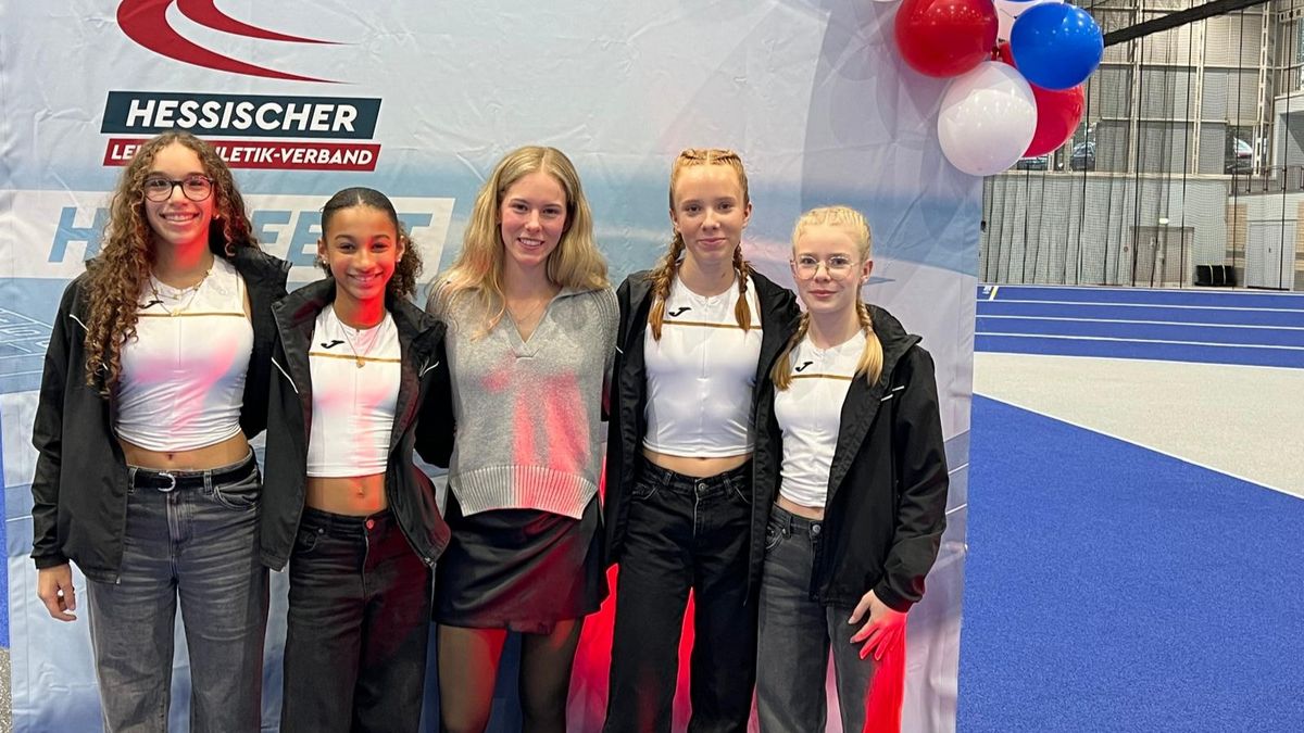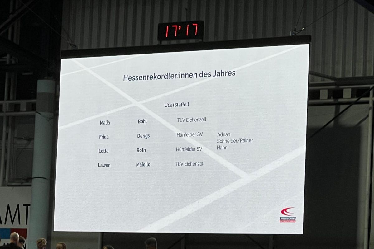 Dazu gehörten u.a. Athletinnen der weiblichen Jugend U14 der Startgemeinschaft Hünfeld-Eichenzell-Flieden, die in der Besetzung Malia Bohl, Frida Derigs, Lotta Roth, Lawen Maiello über 4 x 75m einen neuen Hessenrekord aufgestellt haben..Malia und Lawen vom TLV Eichenzell, Frida und Lotta vom Hünfelder SV.