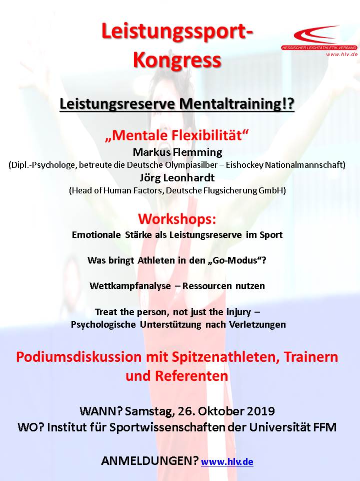 Jeder von uns kennt das Phänomen, der Athlet ist aus Trainingssicht optimal auf einen Wettkampf vorbereitet, er ist gesund, das Wetter stimmt und doch klappt es nicht mit der guten Leistung. Erklärt wird die nicht erwartungsgemäße Leistung mit „der Kopf hat nicht mitgespielt“... <link file:39690 download internal link in current>weiter geht es in einer pdf- Datei.