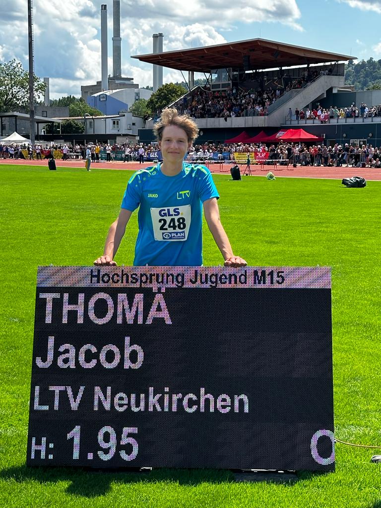 Eine überragende Leistung an dem Wochenende gelang Jacob Thomä. Der Athlet des LTV Neukirchen, der unter anderem auch von Günter Eisinger trainiert wird, brillierte mit deutscher Jahresbestleitung und dem ersten Platz in der Hochsprungkonkurrenz. 1,95m brachten ihm die ersehnte Goldmedaille.