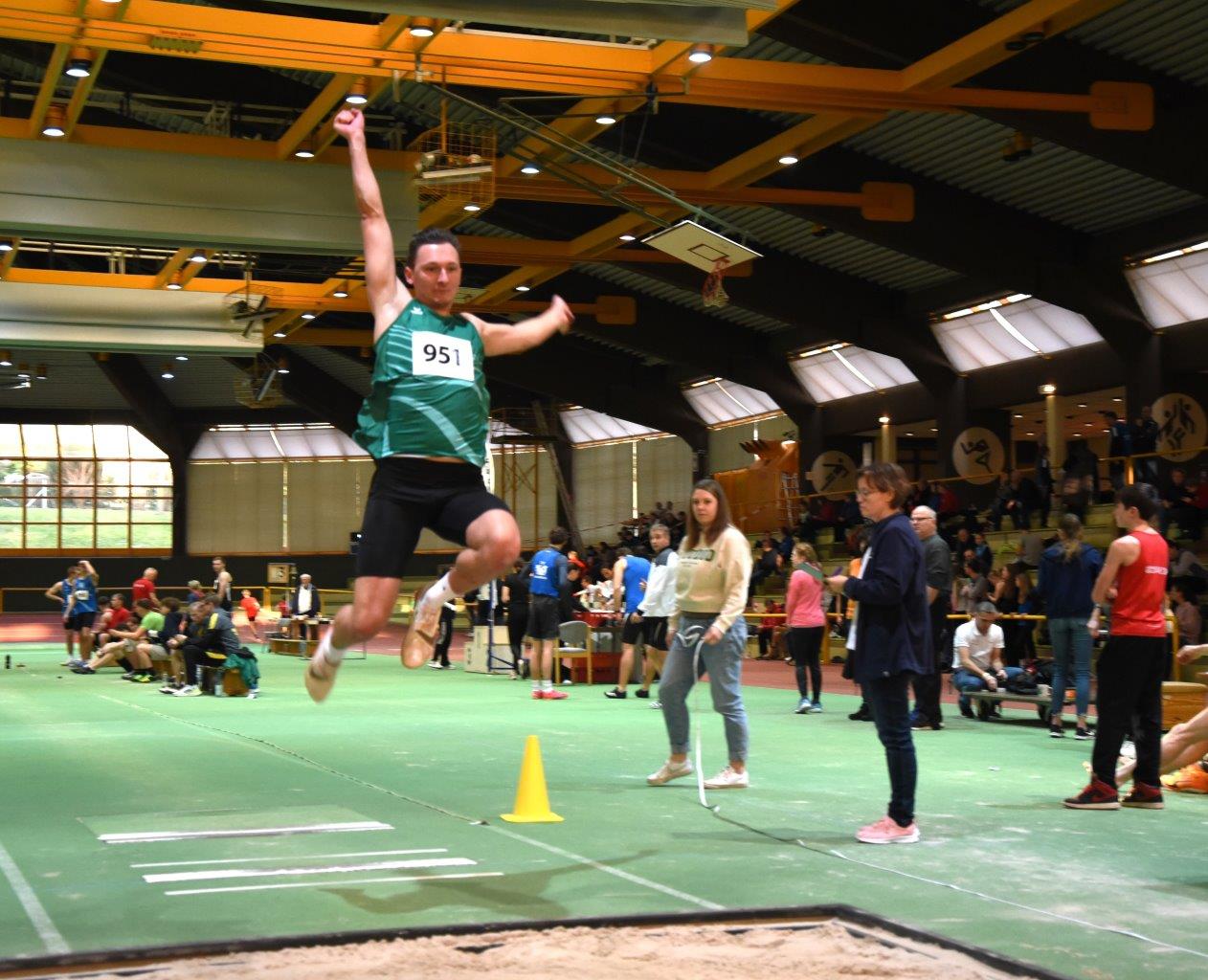 Über die Hallenrunde sprintete Benedikt Tschuppik (TSV Kirchhain) nach 24,30 Sekunden als Sieger ins Ziel und holte mit starken 6,13 Metern im letzten Versuch im Weitsprung den zweiten Titel.