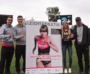 Nach dem Auftakt beim Handball-Bundesligaspiel der MT Melsungen gegen den TuS N-Lübbecke hat der Hessische Leichtathletik-Verband seine Promotion-Tour für die DM in Kassel (18./19. Juni) beim Freundschaftsspiel des Fußball-Regionalligisten KSV Hessen Kassel gegen den Bundesligaklub 1. FC Köln fortgesetzt. Im Auestadion warb die nationale Top-Langstreckenläuferin Laura Hottenrott vom GSV Eintracht Baunatal für die Titelkämpfe in ihrer Heimatregion. Eine durchaus gelungene Aktion, was von dem anschließenden Freundschaftskick nur bedingt gesagt werden kann. Denn die Spieler aus Kassel taten in der ersten Spielminute - nichts. Das heißt sie protestierten im Stillstand gegen ausstehende Gehaltszahlungen ihrer Vereinsführung. Bewegung kam erst danach in die Partie, was am Ergebnis von 5:3 deutlich wird. Der Saisonabschluss des KSV Hessen Kassel wurde von 5.100 Zuschauern verfolgt. Zum Abschluss der DM-Promotion sind DLV und HLV am nächsten Sonntag, 22. Mai, beim zweiten Handball-Kooperationspartner HSG Wetzlar zu Gast. Die Mittelhessen laufen um 17.30 Uhr in der Rittal-Arena gegen den Tabellenführer Rhein-Neckar Löwen auf. (tin.)
