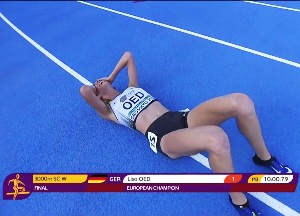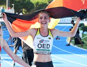 Lisa Oed vom SSC Hanau-Rodenbach hat am Samstagabend bei den U20-Europameisterschaften in Grosseto (Italien) den ersten Titel für den Deutschen Leichtathletik-Verband gewonnen und damit nach ihrem Erfolg bei der U20-Berglauf-EM vor zwei Wochen in Kamnik (Slowenien) eine weitere Glanzleistung gezeigt. Mit einer pfeilschnellen letzten Runde ließ die 18-Jährige die Favoritin Tatsiana Shabanava (Weißrussland/10:03,32) hinter sich und lief in persönlicher Bestzeit von 10:00,79 Minuten zur Goldmedaille. Platz drei holte sich die Türkin Uskun Gülnaz (10:19,44). Dabei hatte das Rennen mit einem Schreckmoment begonnen: Mitfavoritin Lili Anna Toth stürzte an einem Hindernis, die weiteren Läuferinnen stolperten über sie. Die Ungarin konnte das Rennen nicht wieder aufnehmen, obwohl ihre Teamkollegin Tira Pavuk bei ihr blieb und sie zum Weitermachen ermunterte. Was dazu führte, dass auch diese aussichtslos zurückfiel.<ENDE/>