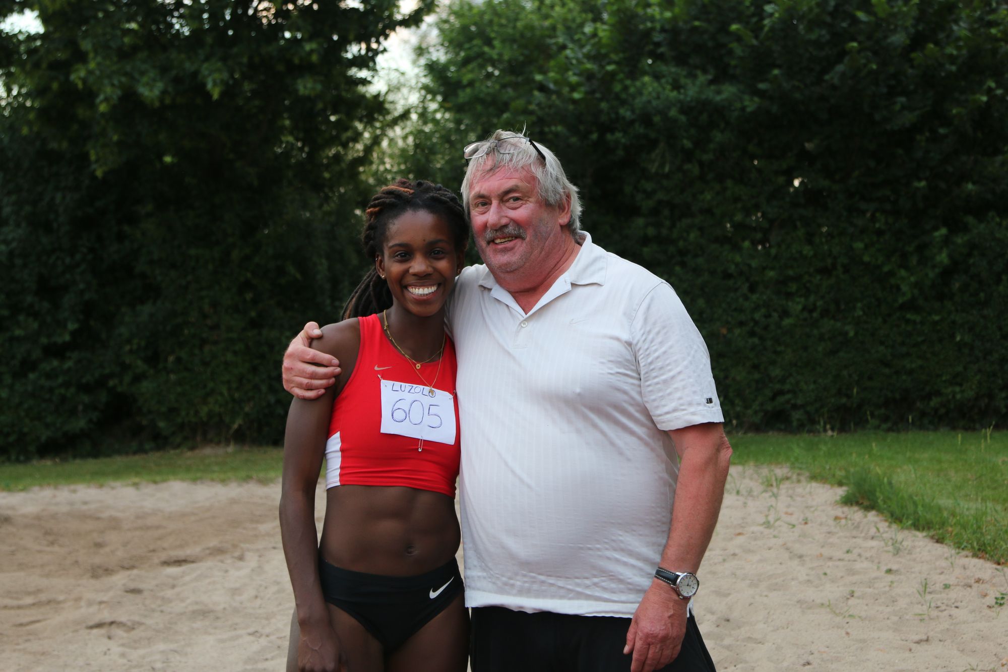 Gleich der erste Sprung „passte“ auf Anhieb und Maryse flog auf 6,20 Meter und steigerte sich im Laufe des Wettkampfes dann noch auf 6,24 Meter. „Als es gleich im Ersten so gut geklappt hat, ist eine unglaubliche Last von mir abgefallen. Es waren so viele Emotionen auf einmal“, berichtet die 24-jährige Biologiestudentin. Die Wahl eines kleinen Sportfestes in der Provinz war gewollt, um etwaige belastende Faktoren von außen möglichst gering zu halten. „Ich wollte ohne Druck einfach springen und schauen, was passiert. Es haben mir so viele Menschen in der schwierigen Zeit geholfen, das war einfach phantastisch“, verrät die Bundeskaderathletin. Bei ihrem Comeback hatte Luzolo ein 23-köpfiges Team, bestehend aus Familie, Freunden, HLV-Trainern und Vereinskollegen im Schlepptau, die sie unterstützten und anfeuerten. Trainingspartner Gianluca Puglisi (ebenfalls Königsteiner LV) ließ es sich nicht nehmen, mit der Harke den Sand jenseits der sechs Meter zu glätten.
