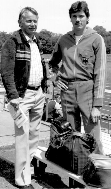Spricht man mit Rudi Steinbrecher über Manfred Hoffmann, spürt man heute noch die Begeisterung über eines der größten Talente, das er je trainiert hat. Die Anfänge waren nicht leicht. „Mannis Vater ist gestorben als er zwölf Jahre alt war. Als er 1974 in die Leichtathletik-Leistungsgruppe kam, fand er dort neue Freunde, der Sport gab ihm Halt in einer schweren Zeit.“ Volker Mazassek, Wolfgang Seidel, Volker Pape und Karl-Heinz-Dörigmann sind hier zu nennen, mit denen Hoffmann als vielseitig talentierter Athlet eine gute Fünfkampfmannschaft bildete. Vorbilder waren die zwei Jahre älteren Schüler der ASS, die gerade den Bundeswettbewerb „Jugend trainiert für Olympia“ gewonnen hatten. „Er hat sofort gesagt, da will ich auch hin“. Schon früh erkannte Steinbrecher Hoffmanns hohes Leistungspotential, obgleich dieser mit 13 Jahren die 100 Meter nur in 13,8 Sekunden lief. „Was seinen Weg in der Leichtathletik immer begleitet hat, waren Ehrgeiz und ein nahezu grenzenloser Optimismus. Er hatte Talent, aber einen schlechten Laufstil.“ Der Hinweis Steinbrechers, an der Ausdauer zu arbeiten, wurde konsequent umgesetzt. Hoffmann schrubbte Kilometer im Brunnenpark und 1976 stand ein anderer Athlet auf der Bahn. „Er war kerzengerade aufgerichtet und hatte plötzlich eine riesige Schrittlänge“, schwärmt Steinbrecher noch heute. Und Hoffmann ließ den zwei Jahre zuvor geäußerten Worten Taten folgen. Die Gustav-Heinemann-Schule gewann mit Hoffmann im Team das Bundesfinale 1976. „Wie er da im Olympiastadion vor der Tribüne über die Bahn stürmte und den 100-Meter-Lauf gewann, das war ein Anblick“.