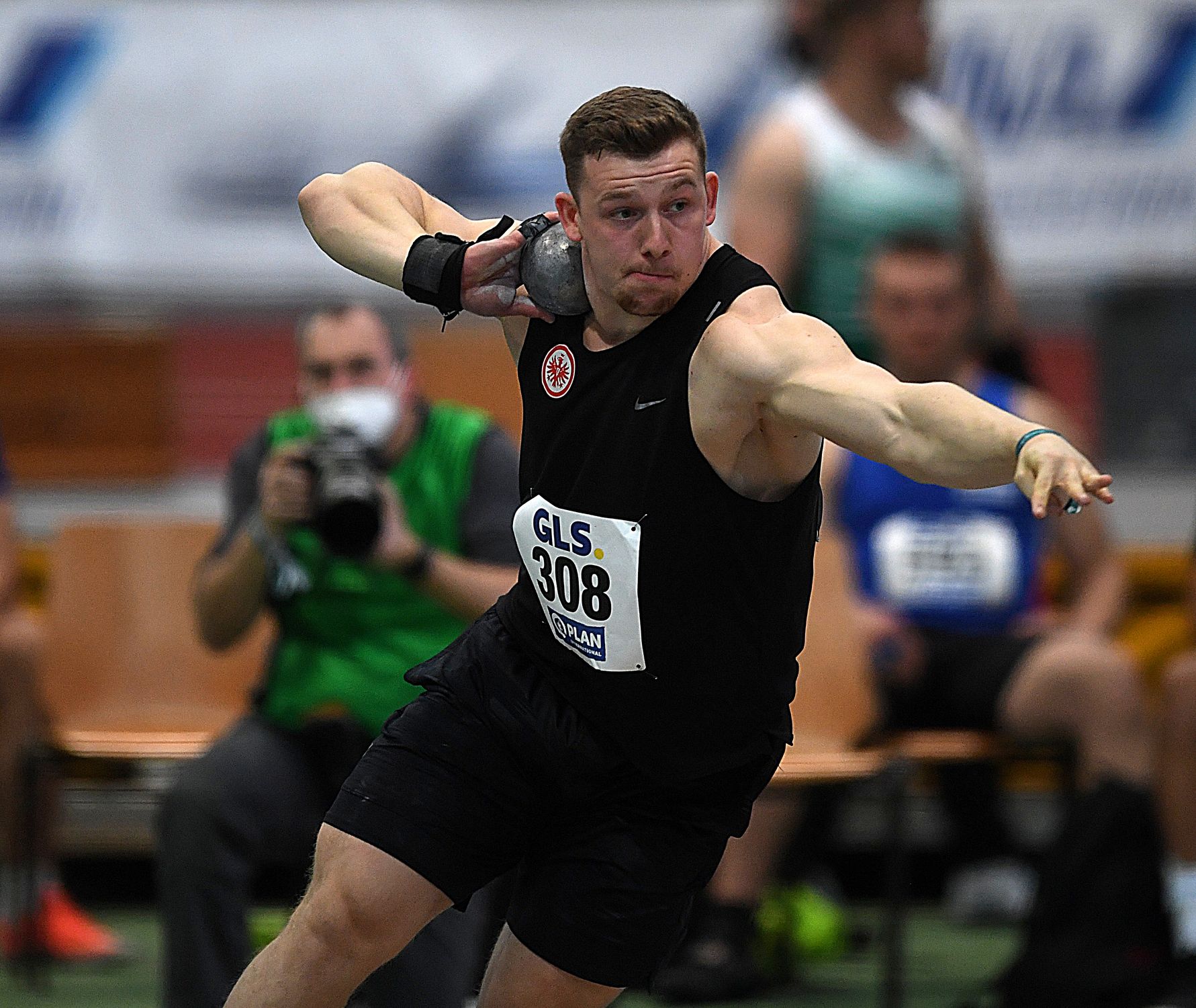 Im Kugelstoßen machte sich Diskus-Spezialist Marius Karges „warm“. Mit seiner Weite von 16,46 Metern (10.) war der Eintrachtler jedoch nicht zufrieden.