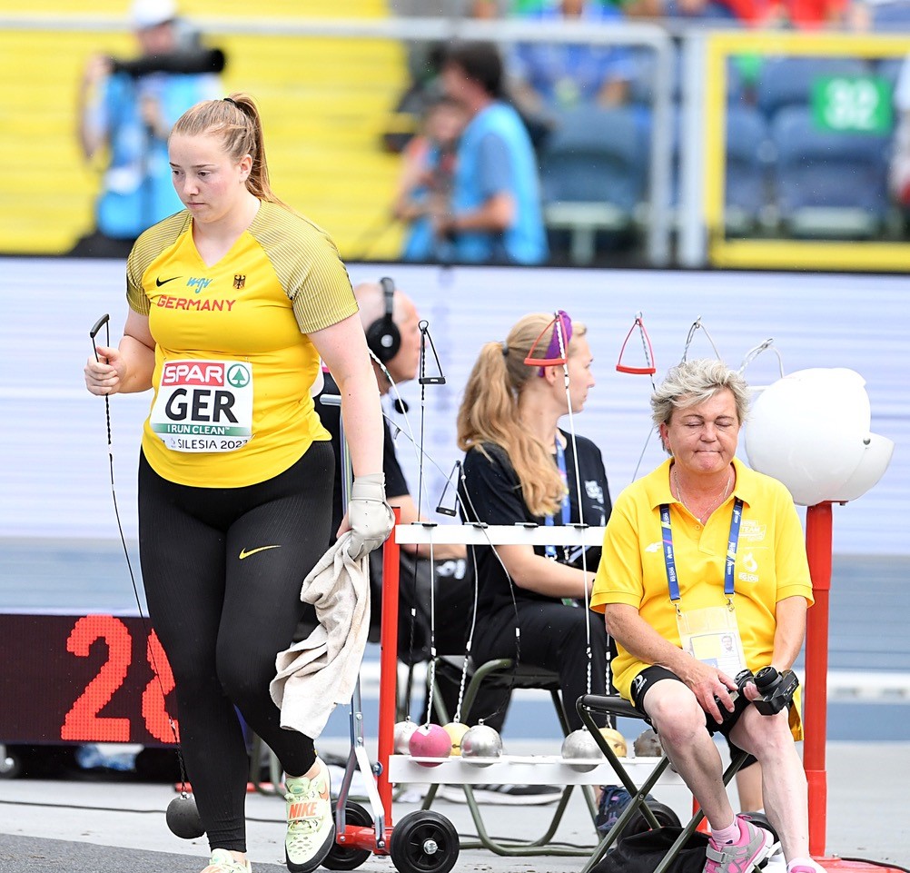 Hammerwerfen: Samantha Borutta legte im ersten Versuch mit einem gültigen Wurf auf 66,42 Meter los. Doch gleich in der zweiten Runde flog der dann auf 68,92 Meter, ehe der Athletin von Eintracht Frankfurt im fünften Durchgang nochmals eine kleine Steigerung auf 68,97 Meter gelang. Das bedeutete am Ende den sechsten Platz in einem hochklassigen Feld. Die Sportsoldatin kam mit diesem Resultat auch ganz nach an ihre Saisonbestmarke von 69,40 Metern ran. Mit einem „70er“ klappte es aber diesmal leider noch nicht. Weiten in diesem Bereich brachte das Spitzen-Quartett in die Wertung. Mit starken 73,26 Metern setzte sich die Italienerin Sara Fantini knapp gegen die noch zur U23 gehörende Finnin Silja Kosonen (73,34 m) durch. Etwas enttäuschend sicherlich der dritte Platz für Malwina Kopron vom Gastgeberland Polen. Die Olympia-Dritte musste mit 71,18 Meter zufrieden sein und hatte lediglich vier Zentimeter Vorsprung auf Charlotte Payne (GBR).