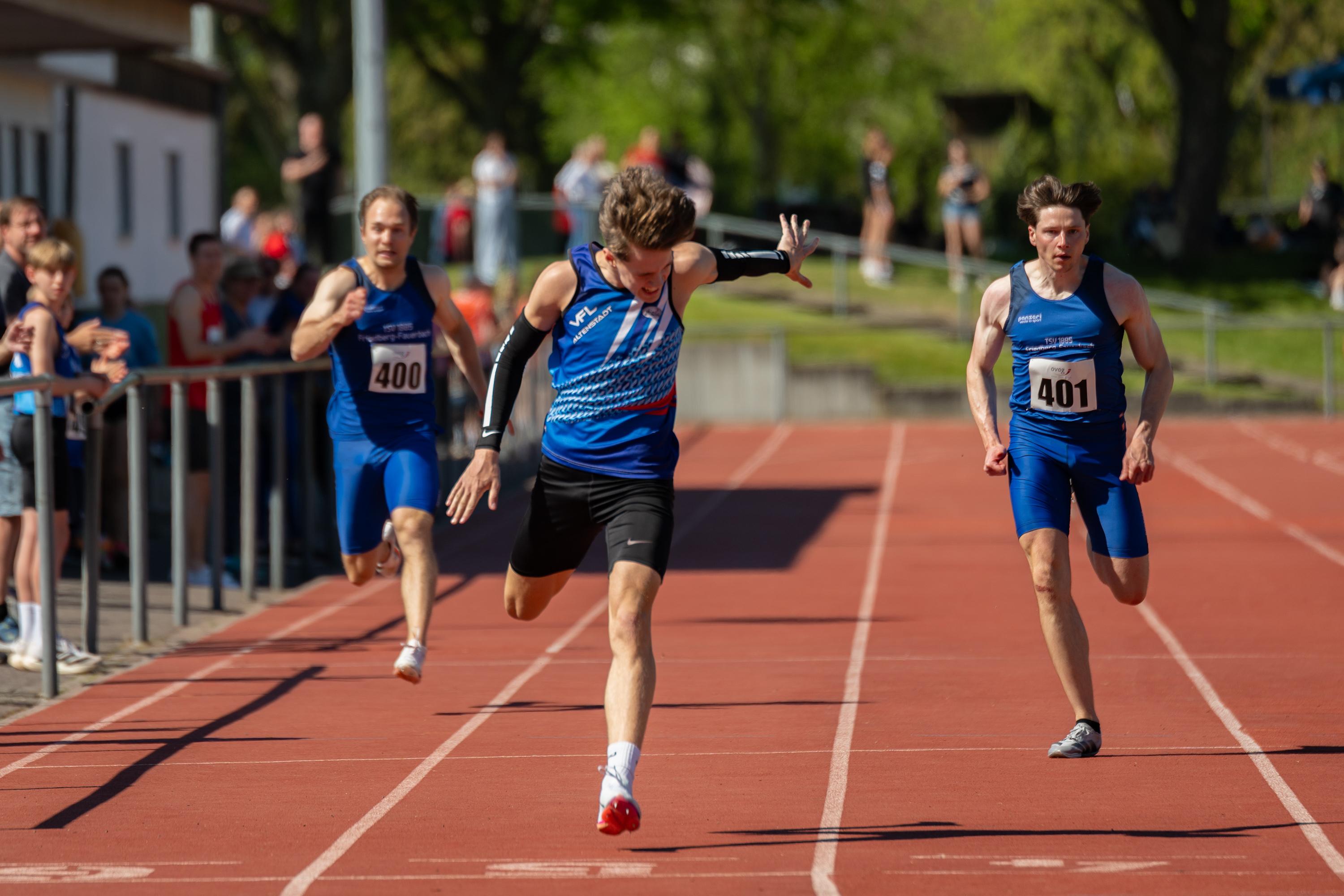 Männer, 100 Meter: 1. Lars Hieronymi (TSV Friedberg-Fauerbach) 10,57 sec, 2. Adrian Fliedner (VfL Altenstadt) 10,61 sec, 3. Nils Keßler (TSV Friedberg-Fauerbach) 10,96 sec.