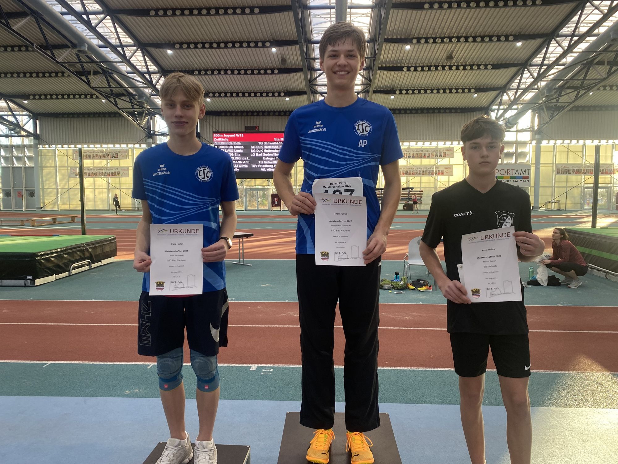 Herausragende Athleten waren Adrian Fliedner vom VfL Altenstadt (M15) und Aaron Lukas Pompetzki vom LSC Bad Nauheim (M14). Beide holten sich jeweils vier erste Plätze im Einzel und führten zum Abschluss der Veranstaltung noch die 4x200-Meter-Staffel der StG Wetterau zum Sieg. Fliedners Sprintzeiten gilt es dabei besonders zu beachten, 7,35 Sekunden über 60 Meter und 37,09 Sekunden über 300 Meter waren eine Klasse für sich. Außerdem sprintete er über 60 Meter Hürden 8,94 Sekunden und sprang 5,27 Meter weit. Pompetzki landete sogar noch weiter hinten in der Sandgrube (5,47 m) und damit als Einziger über die Fünf-Meter-Marke. Über zehn Meter ging es beim Kugelstoßen, unter acht Sekunden blieb er über 60 Meter – ebenso Alleinstellungsmerkmal, auch kreisübergreifend.