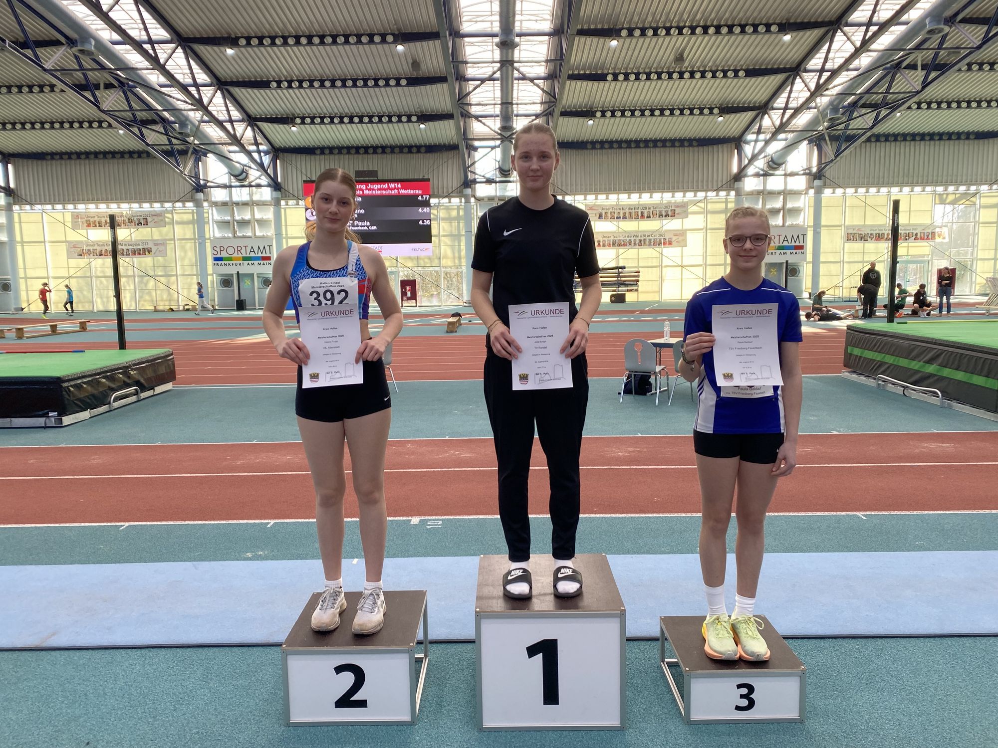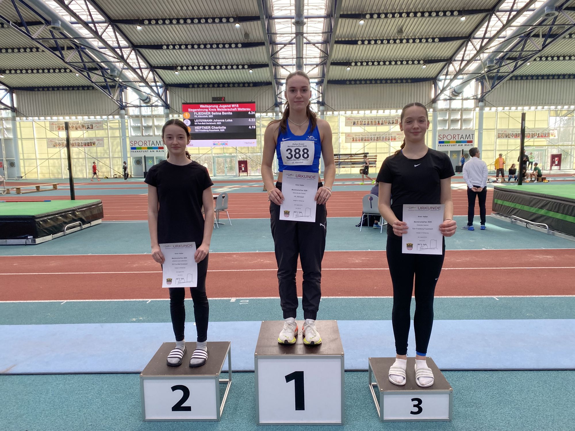 Yvonne Vogel holte sich in der wU18 drei Titel und war auch mit der Staffel des TV Rendel nicht zu schlagen. Drei Einzelerfolge gingen auch auf das Konto von Emma Piel (Fun-Ball Dortelweil/wU20) und Lars Hieronymi (LG Ovag Friedberg-Fauerbach/Männer). Hieronymi, dessen Staffeleinsatz bei den Deutschen Meisterschaften in Dortmund aufgrund von zu vielen Ausfällen bei der LG platzte, wiederholte dabei sein Sprinttriple aus dem Vorjahr über 60, 200 und 400 Meter.