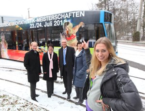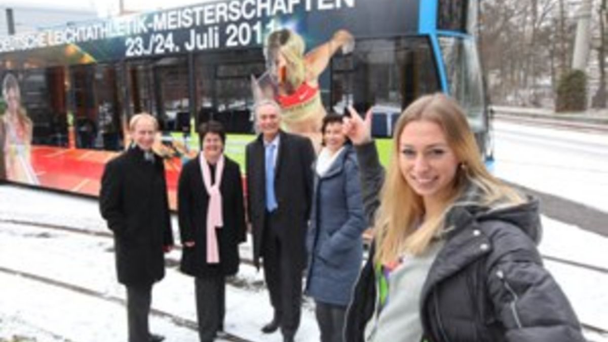 „Auf die Plätze, fertig, los!“ Seit Mittwochmittag fährt die „Wettkampf-Bahn“ durch das nordhessische Streckennetz, um für die Deutschen Leichtathletik-Meisterschaften am 23./24. Juli im Kasseler Auestadion zu werben. Den Startschuss für die Tram gaben im Betriebshof der KVG in Wilhelmshöhe Kassels Oberbürgermeister Bertram Hilgen, der Vorstand der Kasseler Verkehrs-Gesellschaft AG (KVG), Dr. Thorsten Ebert, und HLV-Präsidentin Anja Wolf-Blanke. Als Gast begrüßten die Initiatoren Lisa Ryzih. Die Stabhochsprung-Bronzemedaillengewinnerin bei den Europameisterschaften ist als eine von drei Top-Leichtathletinnen neben der 100-Meter-Europameisterin Verena Sailer und der Vize-Weltmeisterin im Hammerwurf 2009, Betty Heidler, auf der „Wettkampf-Bahn“ abgebildet. „Wir freuen uns sehr, dass der DLV sich für Kassel zum Austragungsort der 111. Deutschen Meisterschaft entschieden hat und hoffen auf begeisternde Wettkämpfe und viele Rekorde im top-sanierten Auestadion“, sagte Hilgen und appellierte zugleich an die Besucher, möglichst zahlreich mit öffentlichen Verkehrsmitteln anzureisen.<ENDE/>