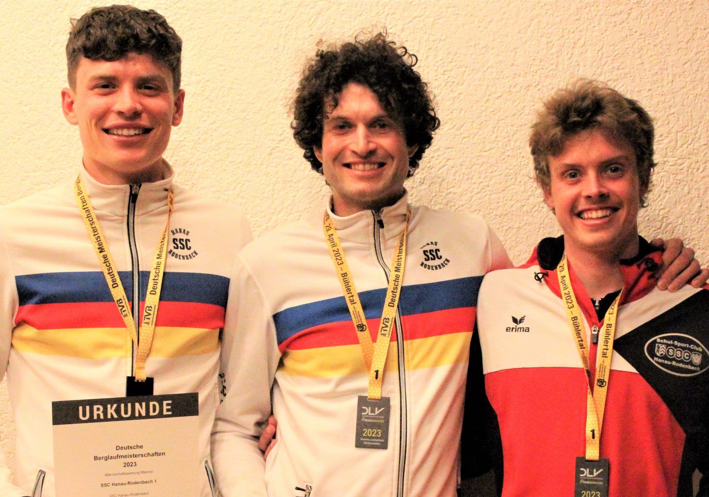 Überraschend gut hielten sich die U20-Jugendlichen, von denen der drittplatzierte Christian Ache in 44:46 Minuten als Jüngster seine erste DM-Medaille feierte. Das 16-Jährige Triathlon- und Lauf-Ass bestach ebenso durch sein kontinuierlich hohes Tempo wie Jonathan Erdniß (5.U20/45:59 Minuten), während Paul Fecher auf Rang sechs in 46:47 Minuten nach längerer Verletzungspause sein Debüt für den SSC Hanau-Rodenbach gab, das dann in der Teamwertung gleich golden glänzte. Silber gewann SSC II. mit Jannik Hümmer (8./50:27 Minuten), Noah Blandamura (9./51:26 Minuten) und Robin Bauer (10./54:00 Minuten).